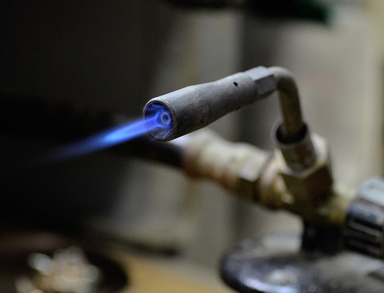 火を使った作業をするには、地金に対する知識が必要不可欠。地金の融点は何度なのか、火を当てることによって地金の性質がどのように変化し、またそれを生かしてどう加工するのか。職人はこのことをきっちりと理解して仕事を行います。
