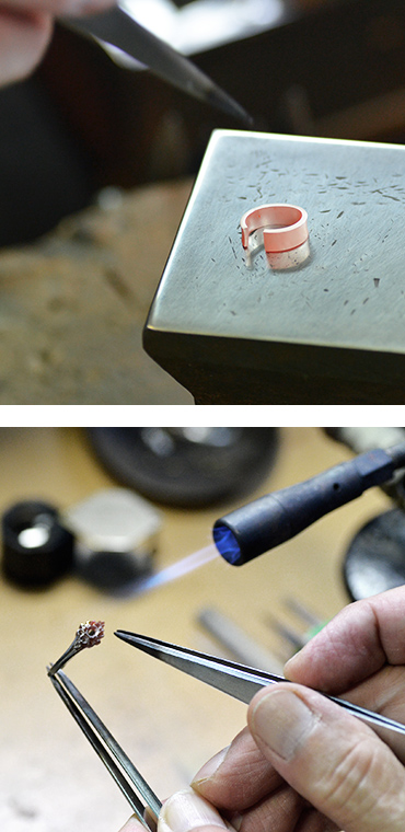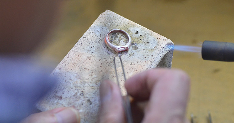 地金の種類によってその融点を見極め、適切な火の当て方をする。ジュエリーの仕上がりを大きく左右するこの工程は、まさに職人の技の見せどころです。