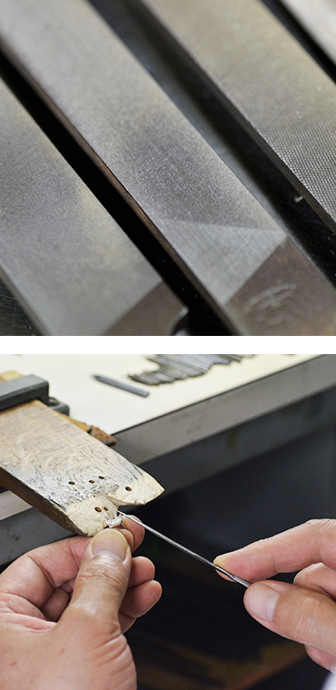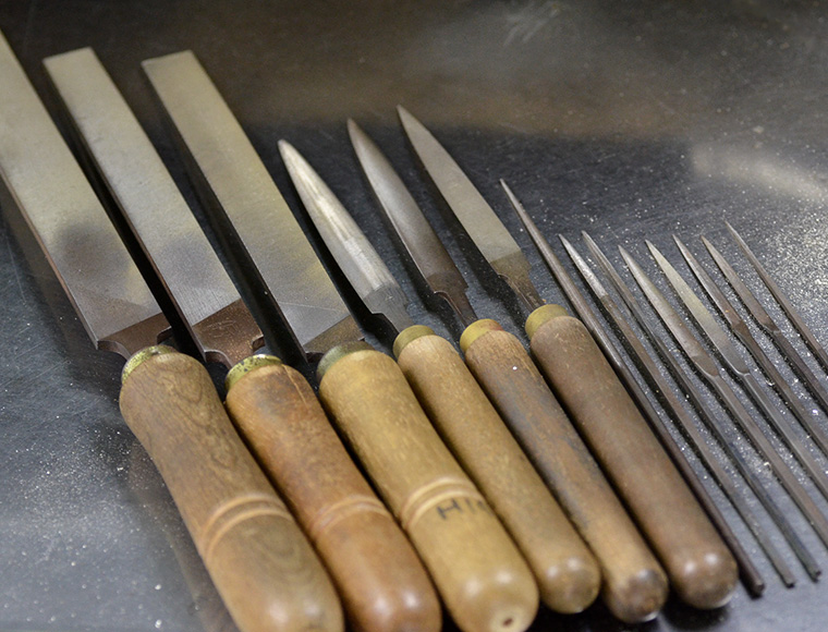 毎日の仕事で職人が一番長い時間手にする道具、それがこの「やすり」です。ジュエリーの形を整えるのに、この道具無くしては語れない、職人の命とも言える道具です。修行をはじめた時から何年もかけてやすりの技術を磨き一人前の職人になります。
