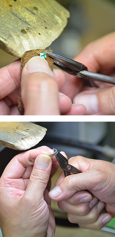 力にまかせた作業だけではありません。「飴を留めてるみたいに難しい。」と職人がこぼすこともあるエメラルドをはじめ、宝石の石留めも、この道具を優しく使っておこなっています。